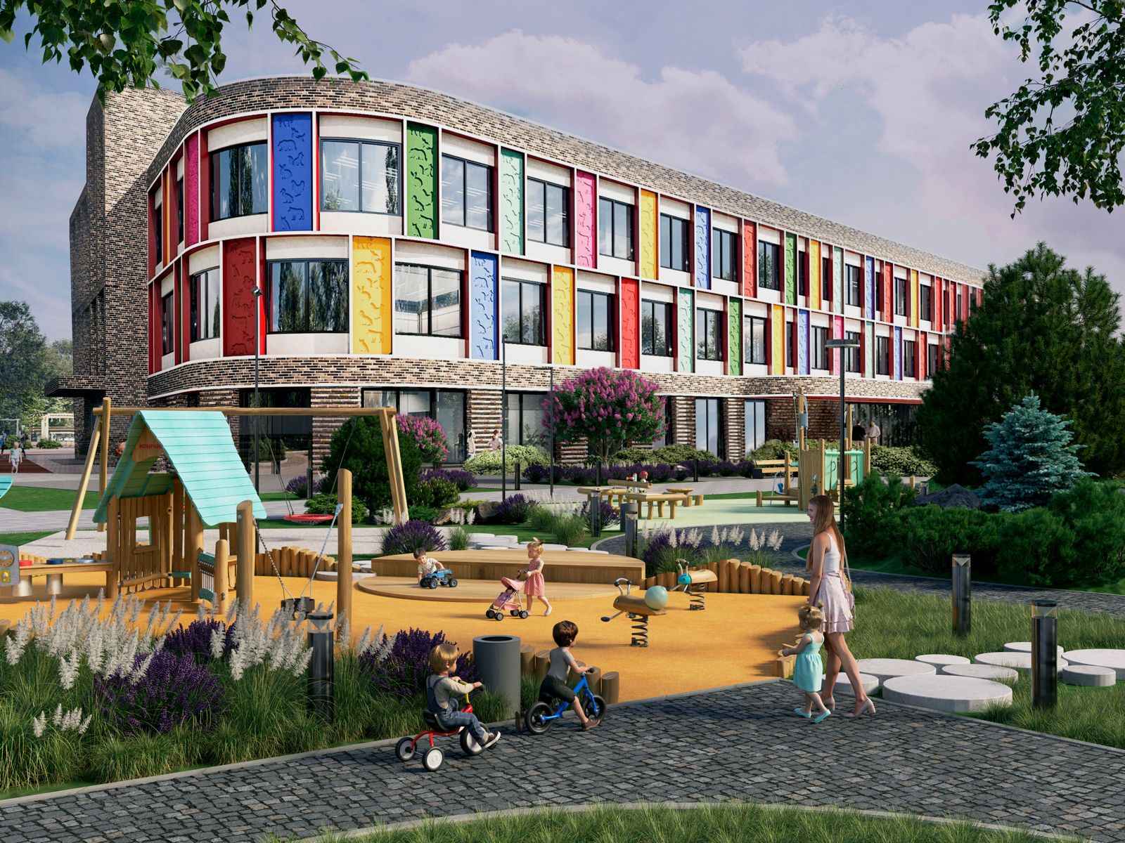 Прилегающая территория займет 3,6 тысячи квадратных метров. Здесь обустроят функциональное пространство в концепции «Путь героя», которая включает в себя безопасные площадки для детей разного возраста, праздничное дерево, детский театр, природный уголок и зону ожидания родителей.